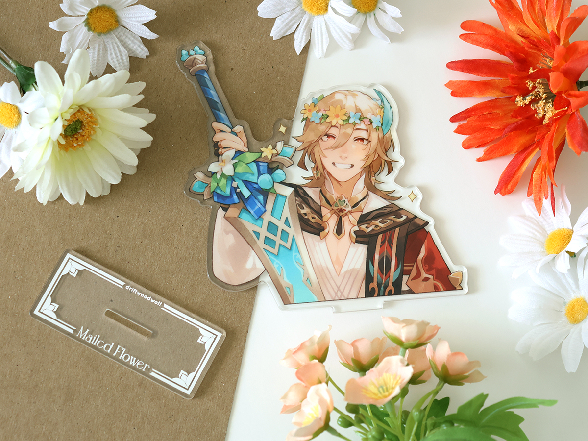13 cm single-sided acrylic standee of Kaveh and his Mailed Flower claymore! The base is 8 cm wide.