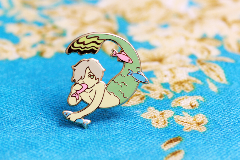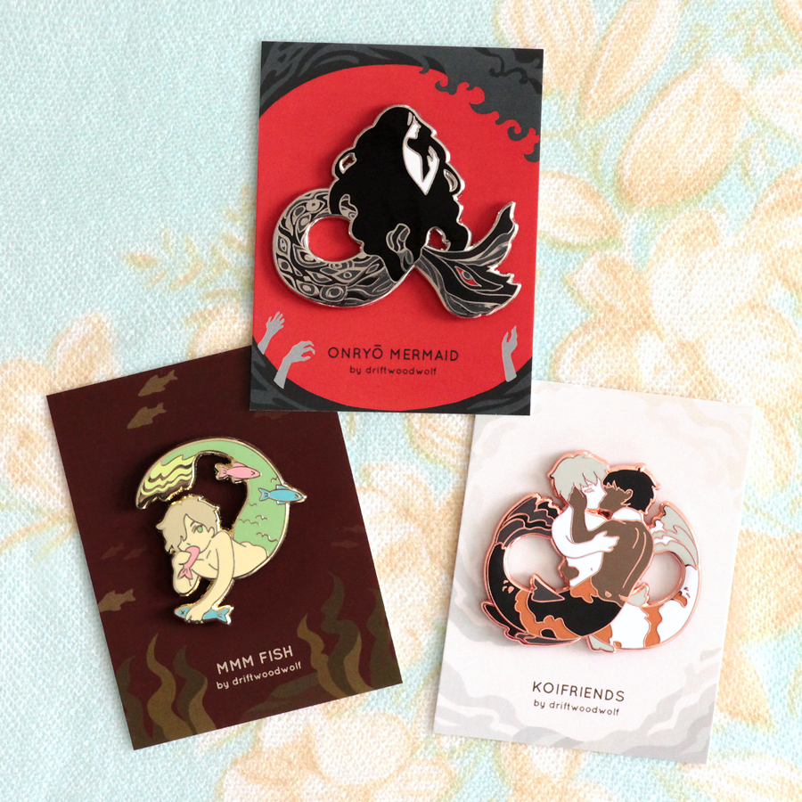 Merfolk hard enamel pins inspired by past illustrations (prints of the Koi and Onryo are also available in my shop, if you are interested)!