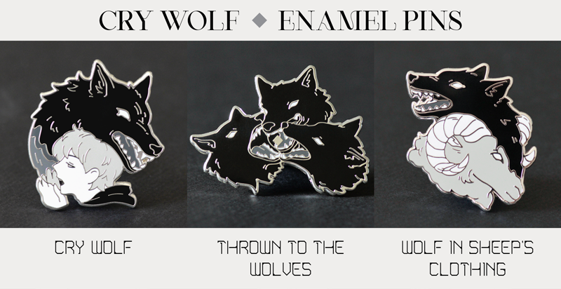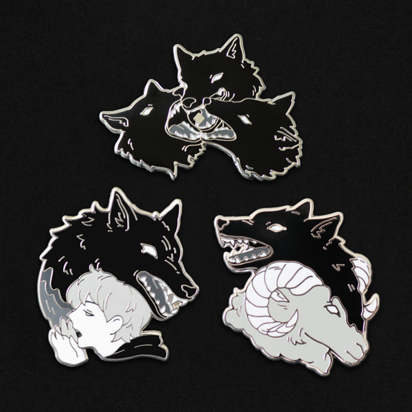 A set of pins inspired by wolf idioms! See second image for the names of each pin. White Fang variants of each design are also available along with a Cry Wolf vinyl sticker (separate listings).