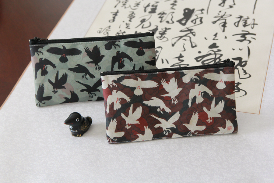 10 x 20 cm canvas pouch featuring a three-legged crow (Yatagarasu) design. Each side has a different color scheme and the interior is white. Perfect for holding pencils, pens, stationery, toiletries, your phone, etc.!