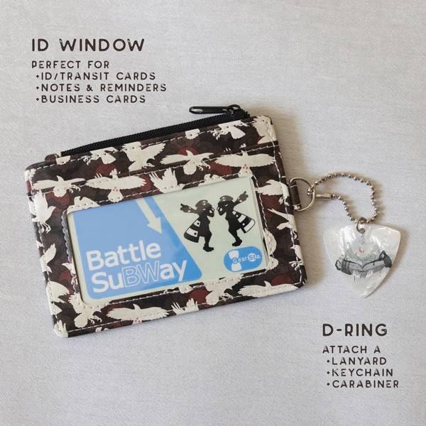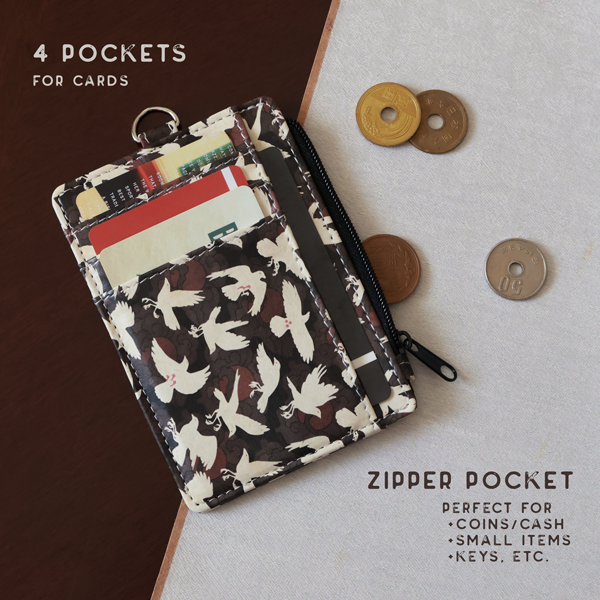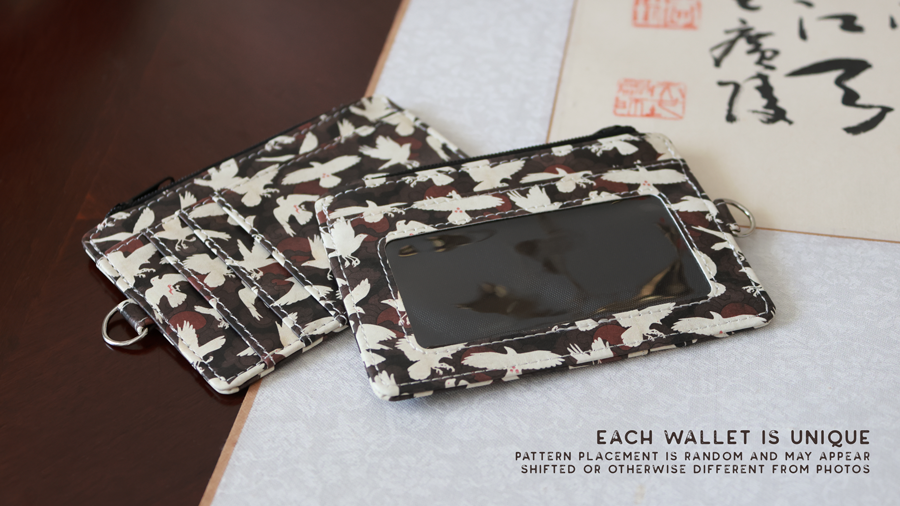 Stylish slim wallet featuring a three-legged crow (Yatagarasu) design. It's perfect for holding your ID or transit pass, cards, cash, keys, etc. And with the D-ring, you can easily attach a lanyard, carabiner, or keychain/charm!