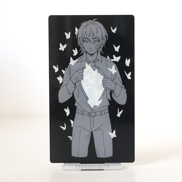 13 cm doubled-sided acrylic standee featuring my OC! The base is 5 cm wide.